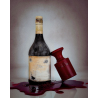 Taques de vi porpra s'estenen per les pàgines d'un diari vell de cuir, impregnant el paper amb marques vívides i irregulars.