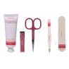 Aquest estoig incorpora eines bàsiques d'alta qualitat per mantenir la teva manicura impecable: unes tisores per a ungles i cutícules, un alicate d'ungles, unes pinces de depilar i una llima d'ungles.